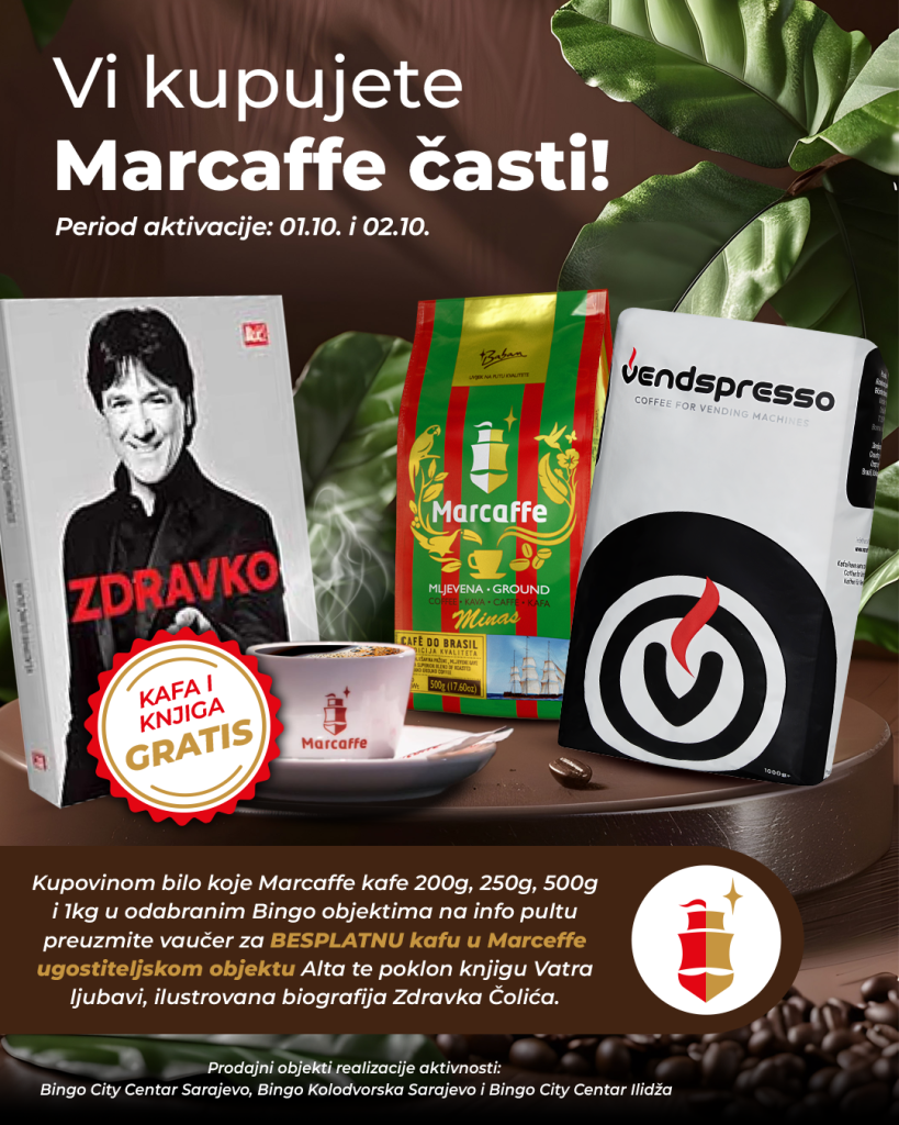 Kupovinom bilo koje Marcaffe kafe od 200 g, 250 g, 500 g ili 1 kg u odabranim Bingo trgovinama, na info pultu preuzmite vaučer za besplatnu kafu u Marcaffe ugostiteljskom objektu Alta, kao i poklon-knjigu Vatra ljubavi – ilustrovanu biografiju Zdravka Čolića.