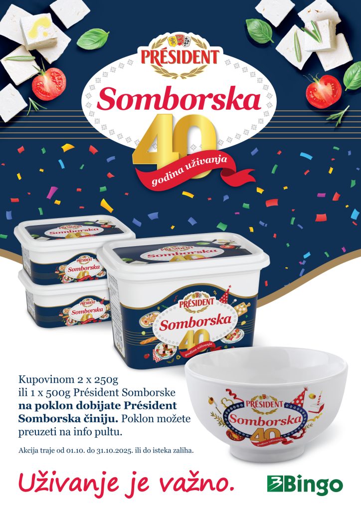 Kupovinom 2x 250 g ili 1x 500 g President Somborske na poklon dobijate President Somborska činiju. Poklon možete preuzeti na info pultu. Akcija traje od 1.10. do 31.10. ili do isteka zaliha. Pravila programa lojalnosti pogledajte u nastavku: