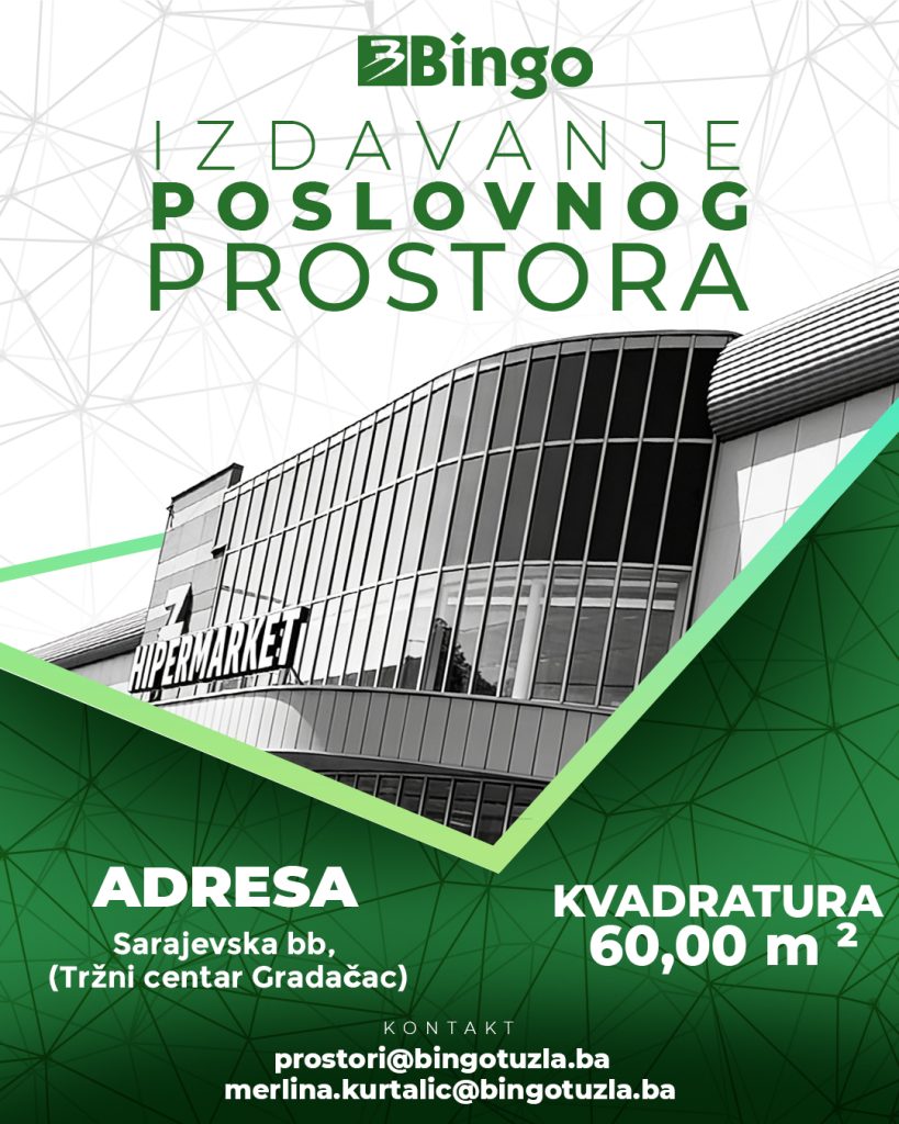 Društvo „Bingo“ d.o.o. export-import Tuzla sa sjedištem u Tuzli na adresi Bosanska poljana bb raspisuje oglas o iznajmljivanju poslovnog prostora površine 60,00 m ² u sklopu Tržnog centra Gradačac na adresi Sarajevska bb.