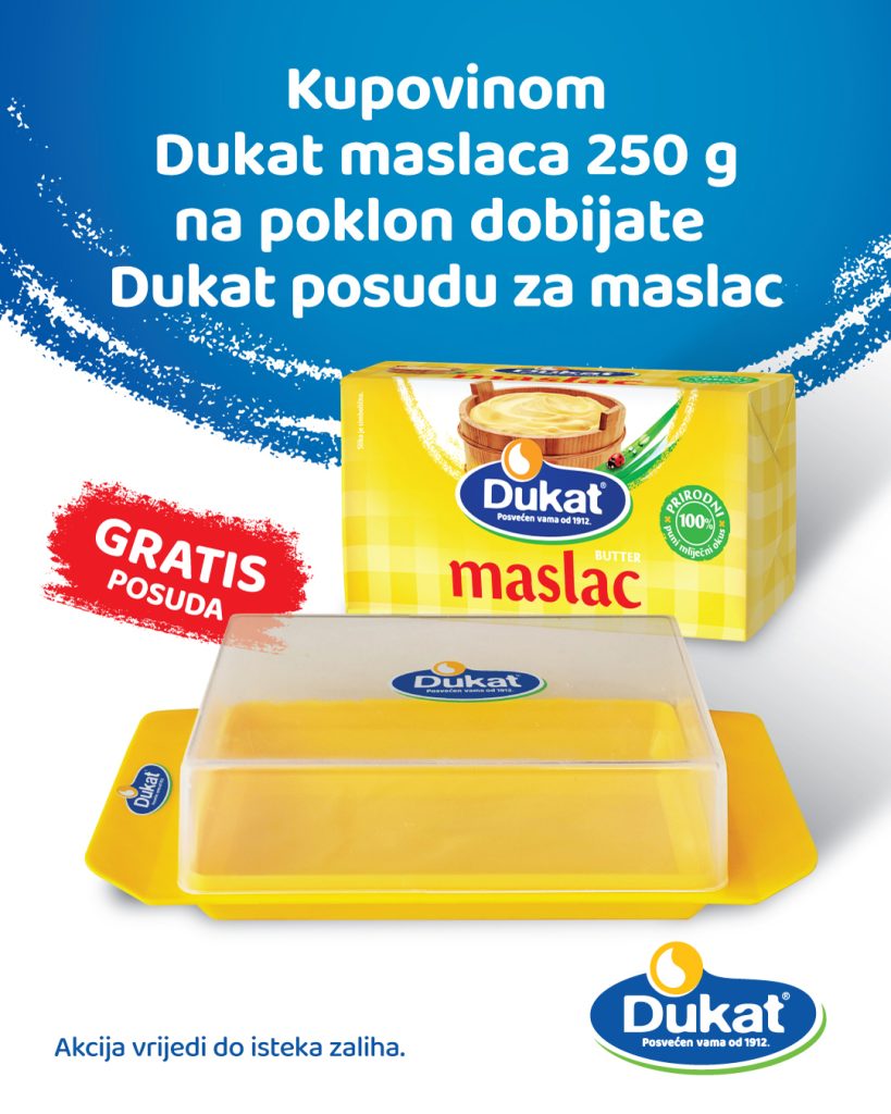 Kupovinom Dukat maslaca od 250 g, na poklon dobijate posudu za maslac. Praktičan dodatak za svaku kuhinju, dostupan do isteka zaliha. Popis objekata u kojima vrijedi akcija pogledajte u nastavku:
