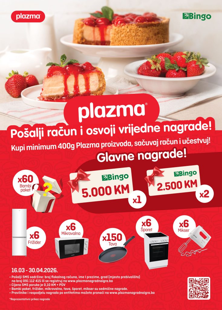 Kupite minimalno 400 g Plazma proizvoda, sačuvajte račun i učestvujte. Pošaljite SMS sa sadržajem: broj računa, ime i prezime, te grad na broj 091 112 415 ili se registrujte na www.plazmanagradnaigra.ba.