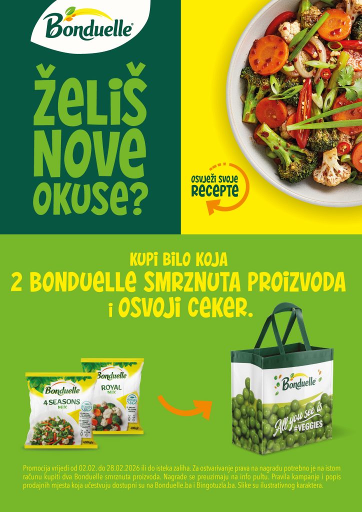 Kupite bilo koja dva Bonduelle smrznuta proizvoda i osvojite ceker. Promocija vrijedi od 2. 2. do 28. 2. ili do isteka zaliha. Nagrade se preuzimaju na info pultu. U nastavku pogledajte pravilnik.
