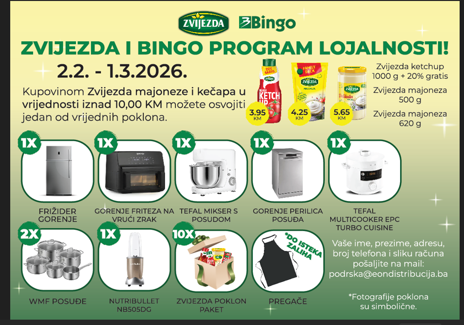 Kupovinom Zvijezda majoneze i kečapa u vrijednosti iznad 10,00 KM možete osvojiti jedan od vrijednih poklona. Prijava za program lojalnosti se vrši putem e-mail adrese podrska@eondistribucija.ba, slanjem slikejednog računa ili više njih i osobnih podataka ( ime i prezime, adresa, broj telefona). Program traje od 2.2. do 1.3.2026. Pravilnik programa lojalnosti pogledajte u nastavku: