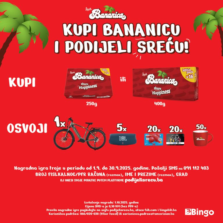 Uz THOMY i Bingo, pravo je vrijeme za vrijedne nagrade! Kupi THOMY proizvode u minimalnoj vrijednosti od 5 KM na jednom računu u Bingo trgovinama, pošalji SMS na broj 091 112 412 ovim redoslijedom: broj fiskalnog računa (razmak) ime i prezime (razmak) grad prebivališta, sačuvaj račun kao dokaz i spremi ...