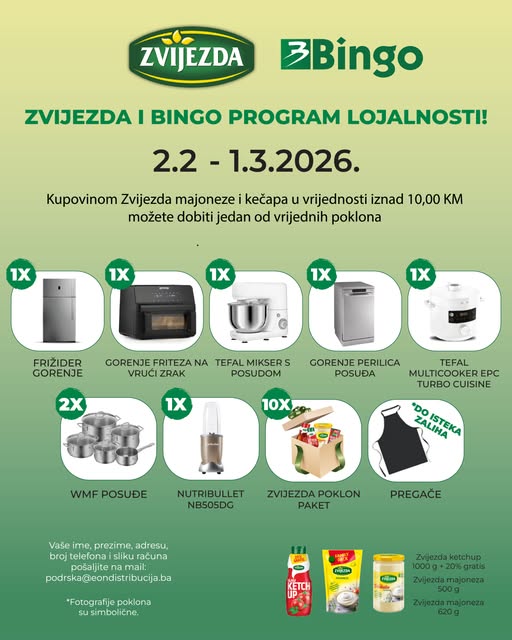 Kupovinom Zvijezda majoneze i kečapa u vrijednosti iznad 10,00 KM možete osvojiti jedan od vrijednih poklona. Prijava za program lojalnosti se vrši putem e-mail adrese podrska@eondistribucija.ba, slanjem slikejednog računa ili više njih i osobnih podataka ( ime i prezime, adresa, broj telefona). Program traje od 2.2. do 1.3.2026. Pravilnik programa ...