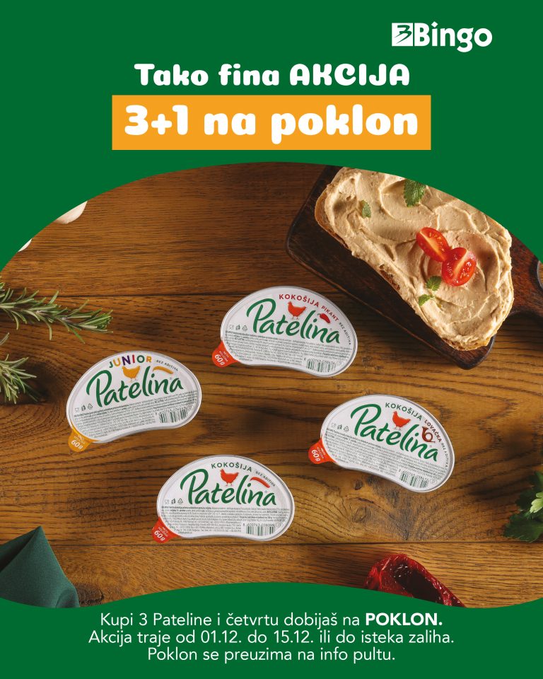 Kupi tri Pateline i četvrtu dobijaš na poklon. Akcija traje od 1.12. do 15.12. ili do isteka zaliha. Poklon preuzimate na info pultu Bingo trgovina. Pravila pogledajte u nastavku: